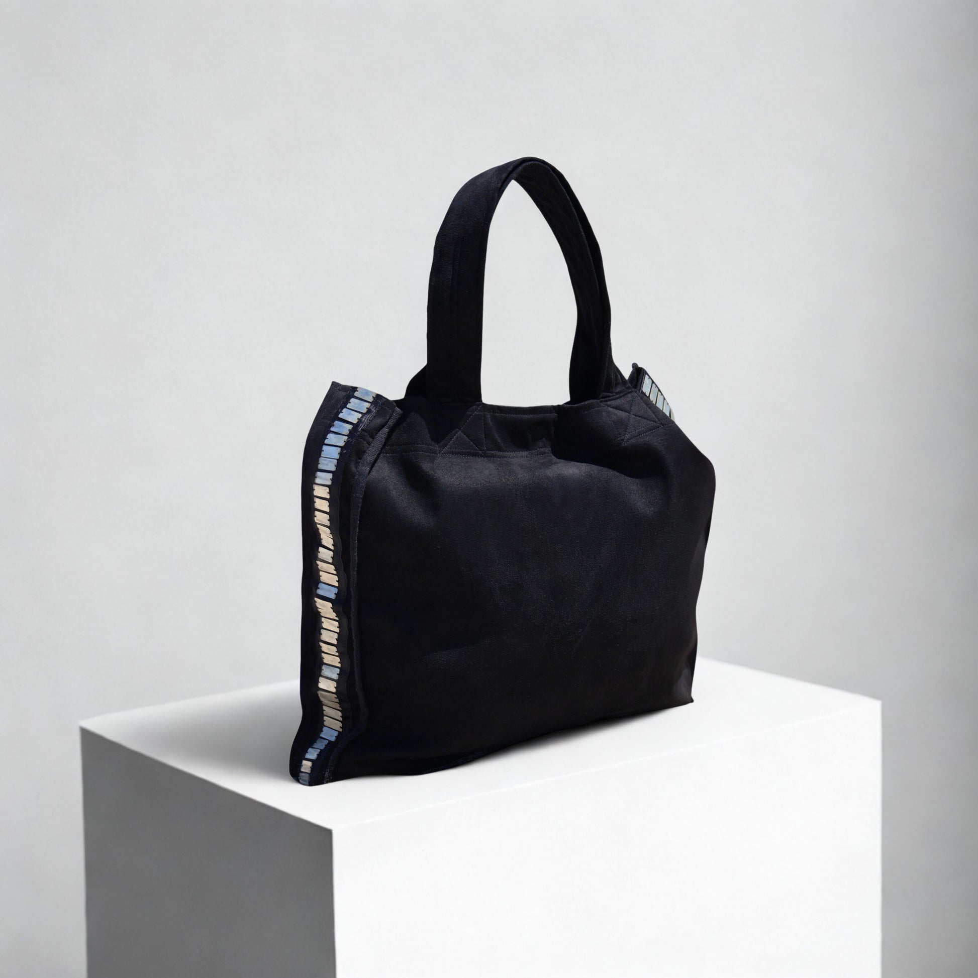 The NIVÉ Tote blends utility with quiet sophistication. Crafted from black suede, it features sleek tonal handles and is subtly elevated with hand embellished beadwork along the side seams. Spacious enough for daily essentials yet refined enough for elevated styling, NIVÉ transitions effortlessly from day to night