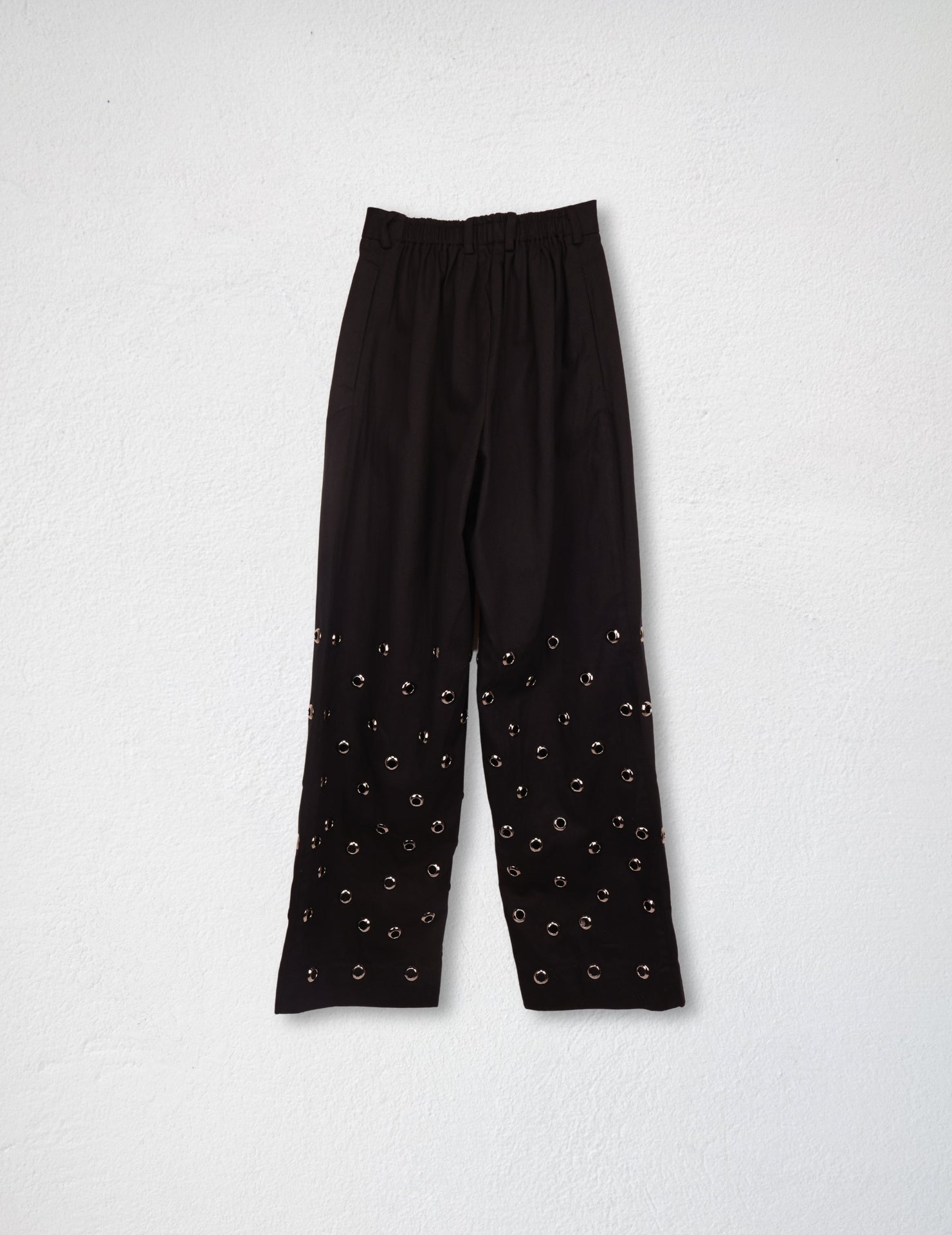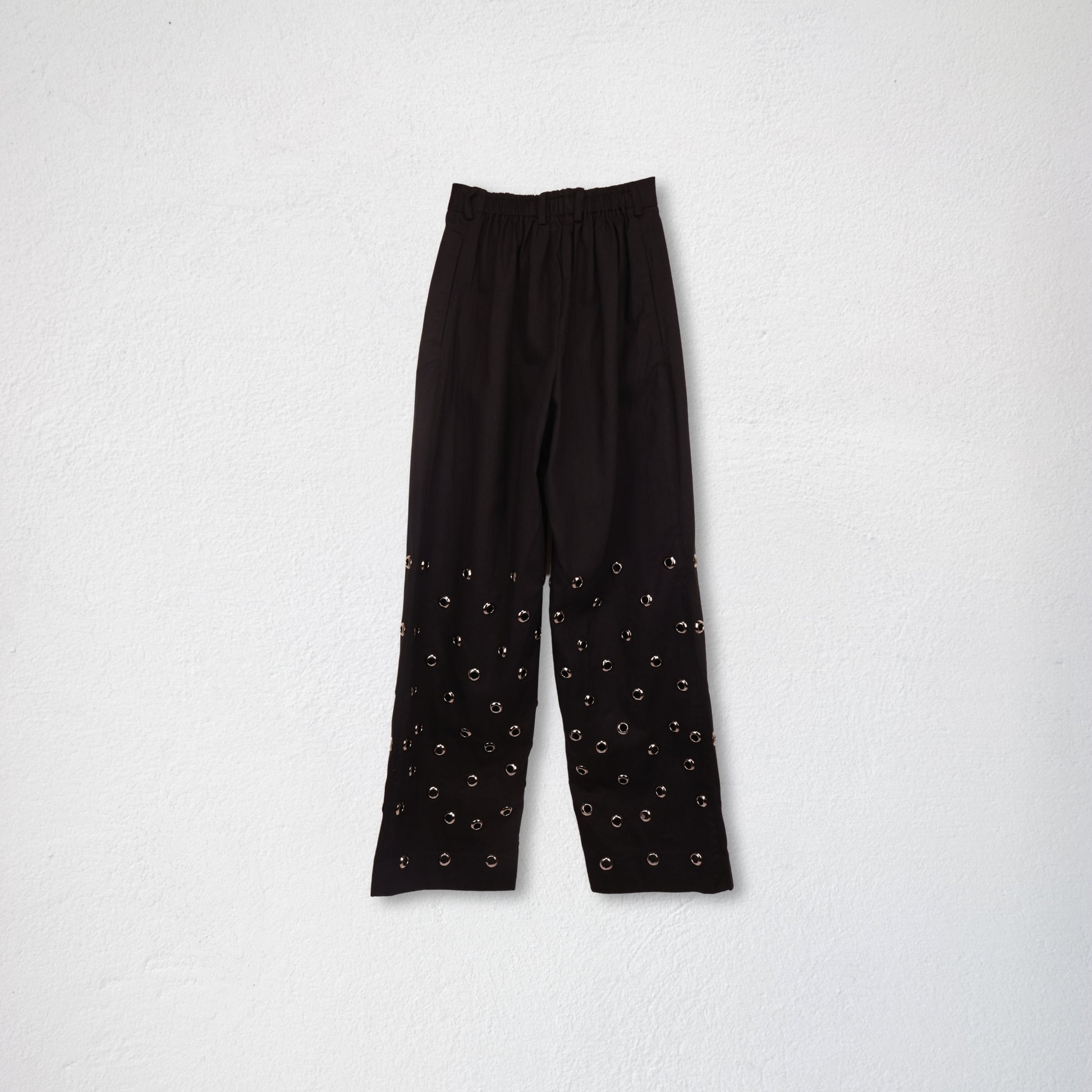 Our RONAN Trousers reimagine ease with attitude. The wide-leg silhouette features a clean waistband finish at the front and an elasticated panel at the back for effortless wear. The highlight lies in the bold grommet-style embellishments that graduate across the lower leg adding depth, movement and a subtle sense of rebellion