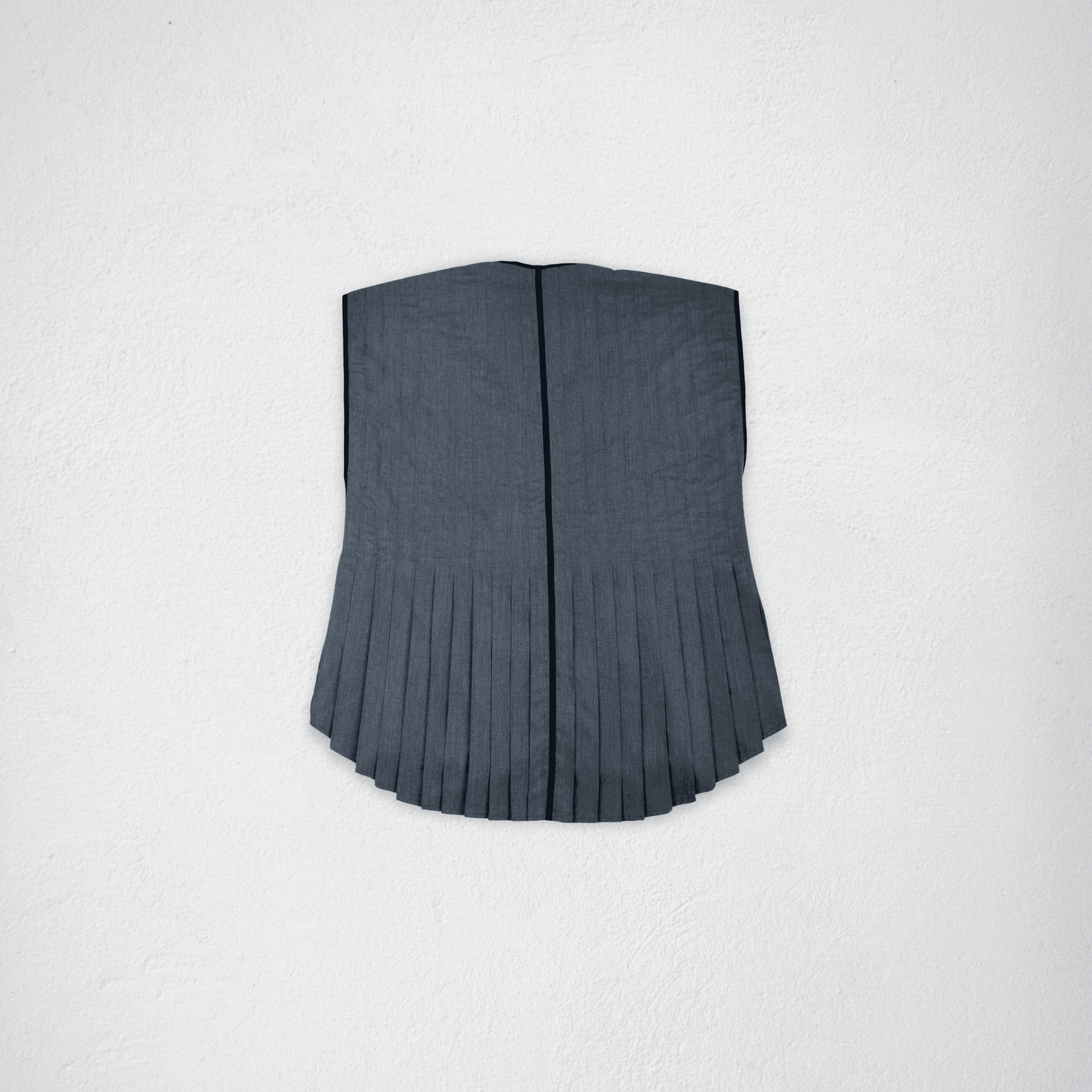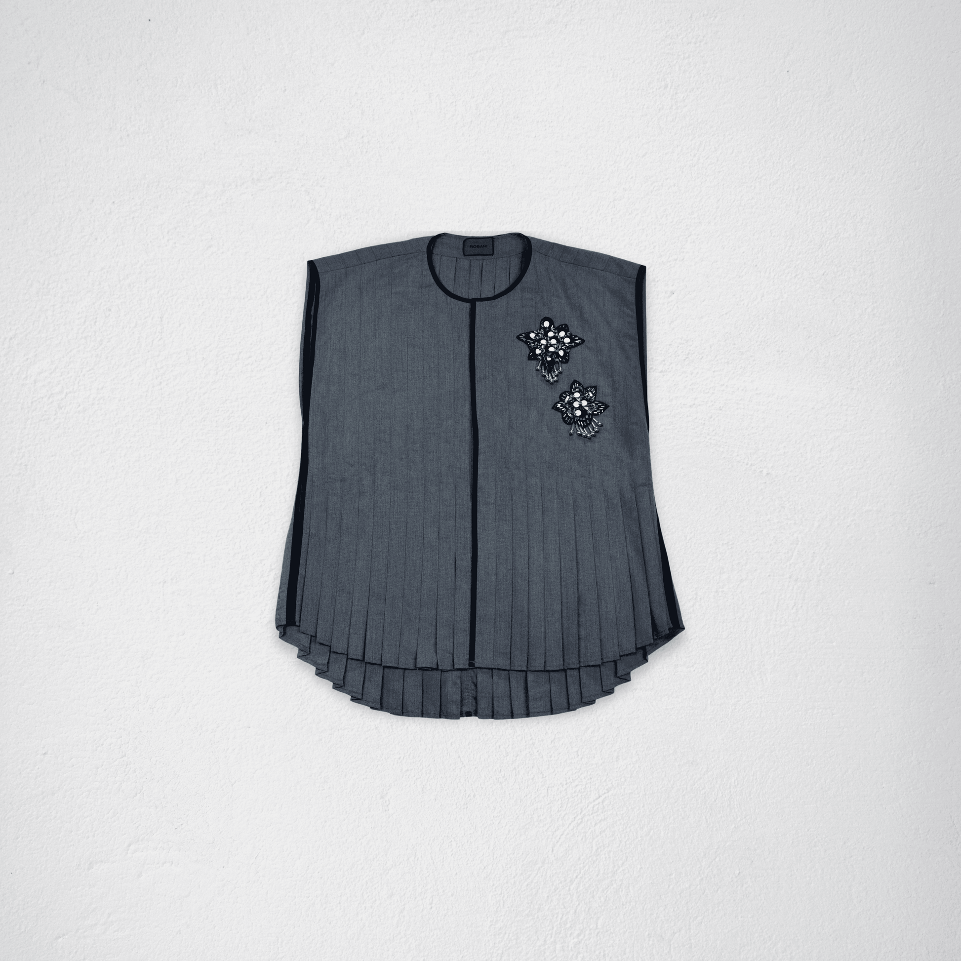 Our PLITA shirt is a sculptural piece defined by precision pleating and a fluid silhouette. Cut without sleeves for effortless layering, it features intricate hand-embroidered embellishments that lend a quiet opulence. Style it over a classic shirt-and-trouser combination for refined minimalism, or pair it with tonal tailoring to highlight its architectural drape.