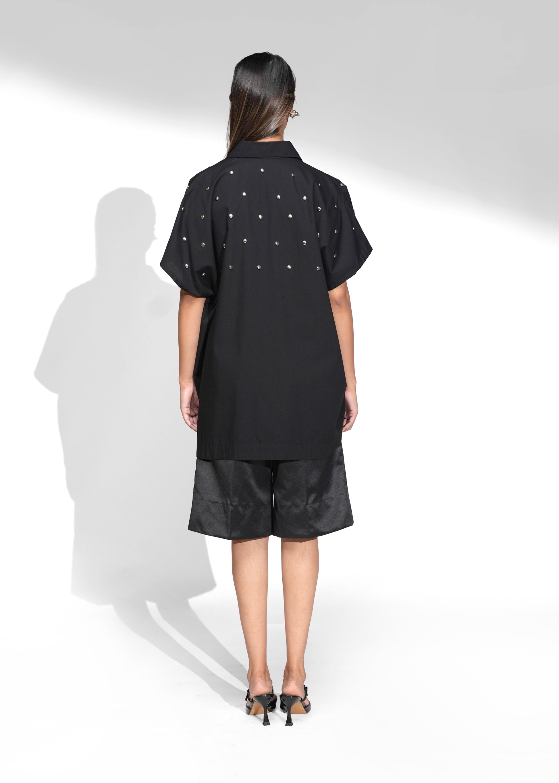 A super-light, oversized poplin shirt with light metallic detailing across the frontΒ
