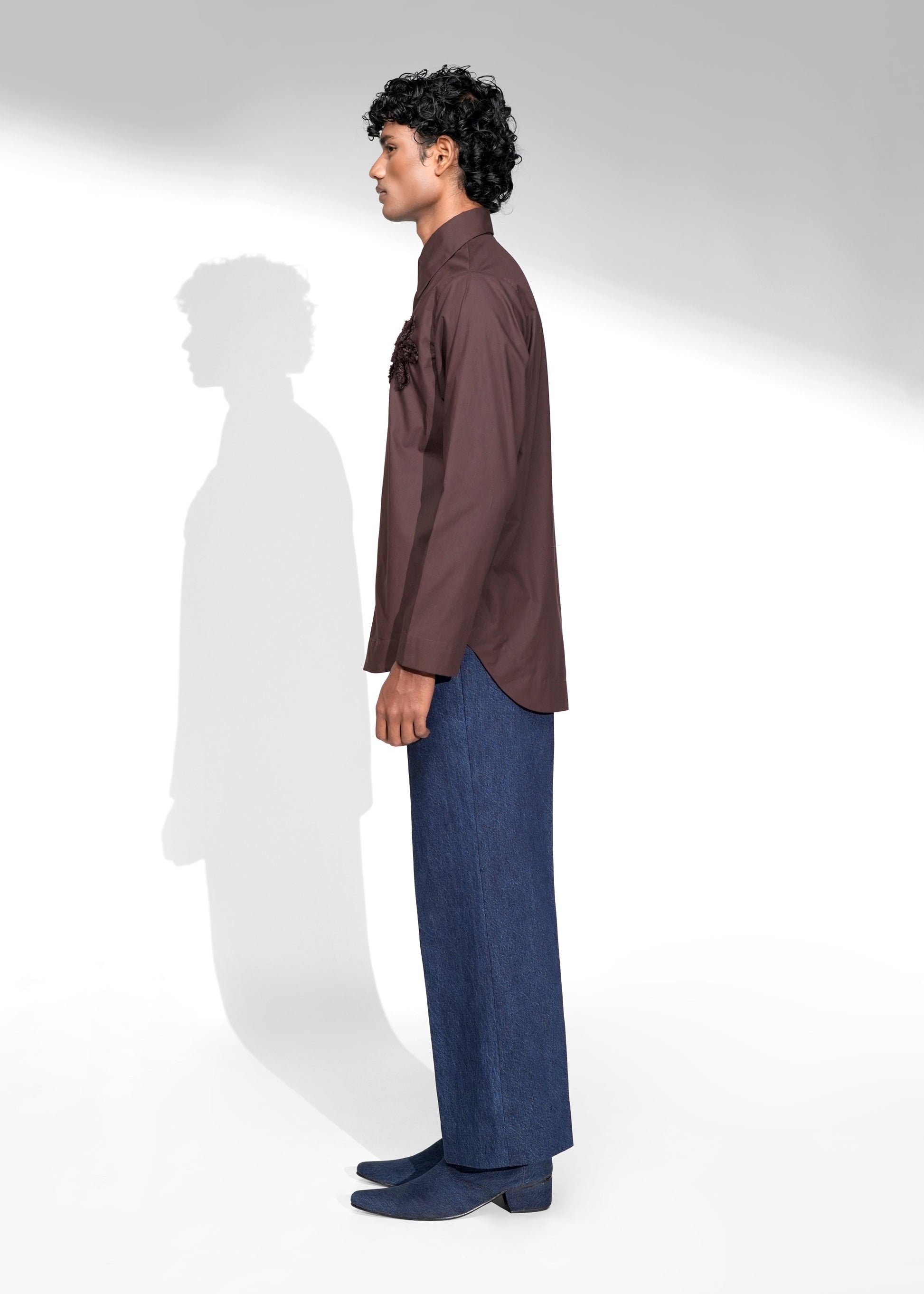 The Ether shirt is a classic button-down in deep brown, detailed with a hand-done floral motif that adds a subtle, expressive touch