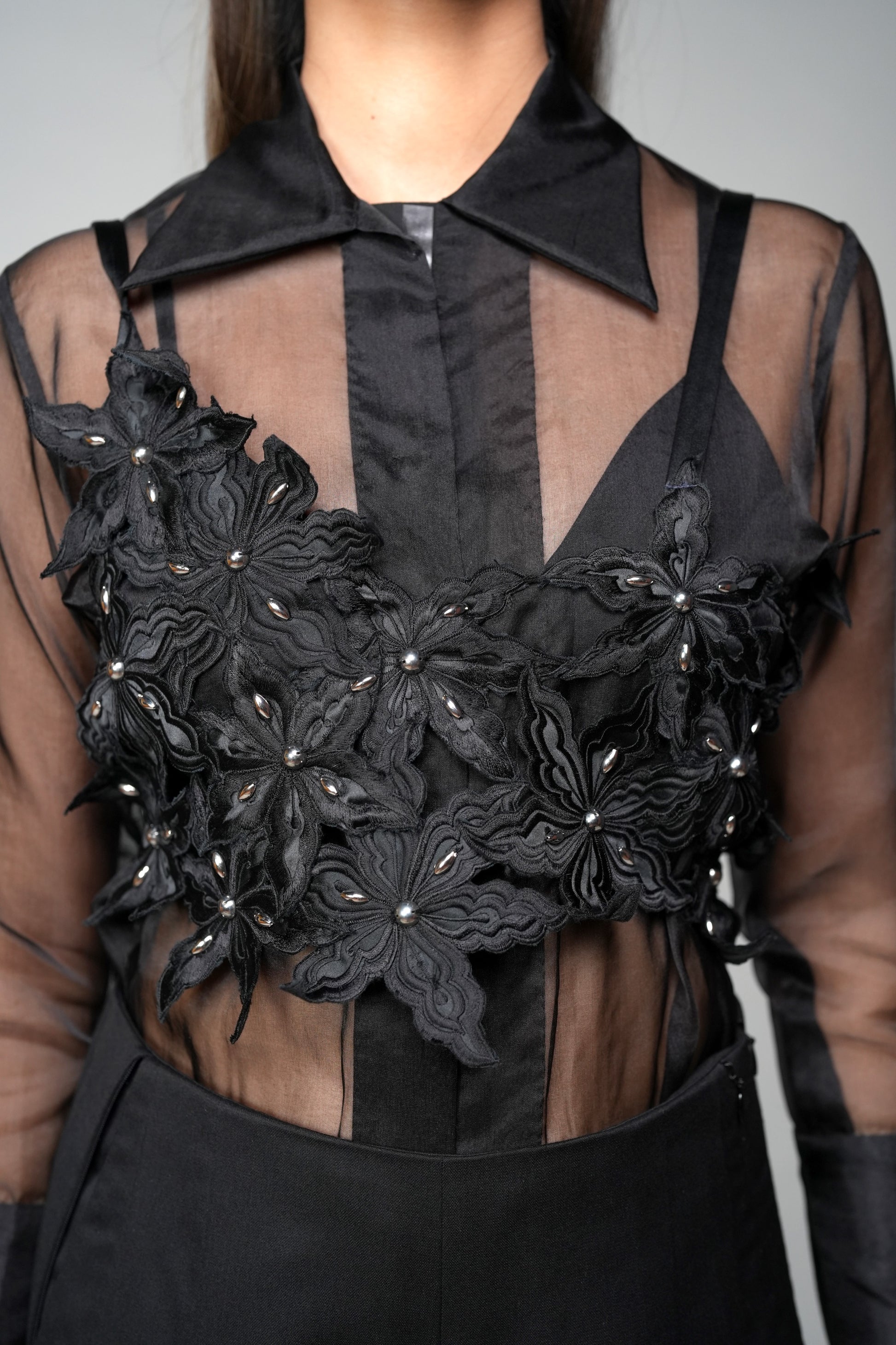 The Moss top features a cluster of embroidered, hand-cut floral motifs stitched together and finished with multiple satin strips for tying it up at the back