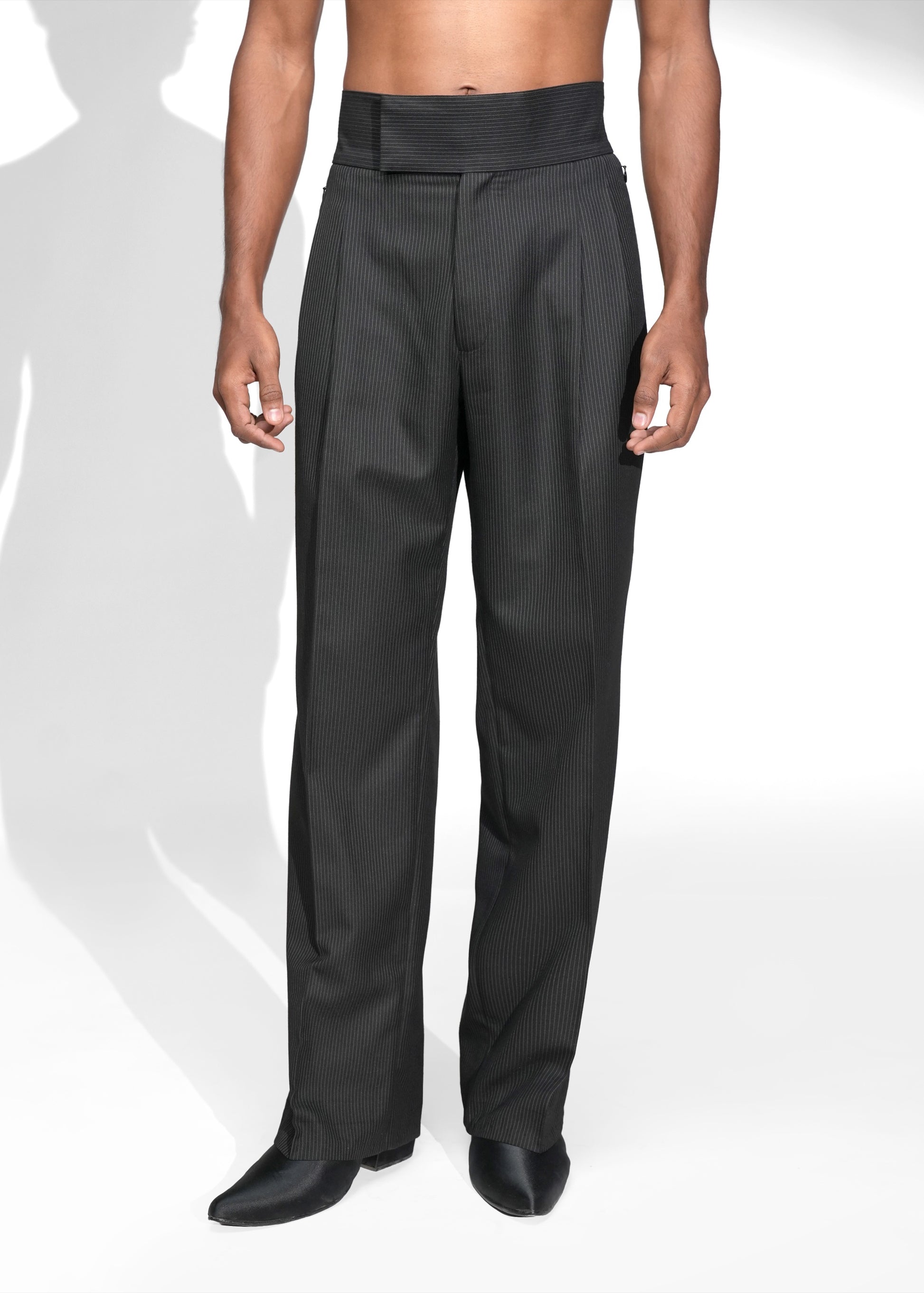 - Details - Pinstripe pleated trousers with 3" broad belt and elastic at the back