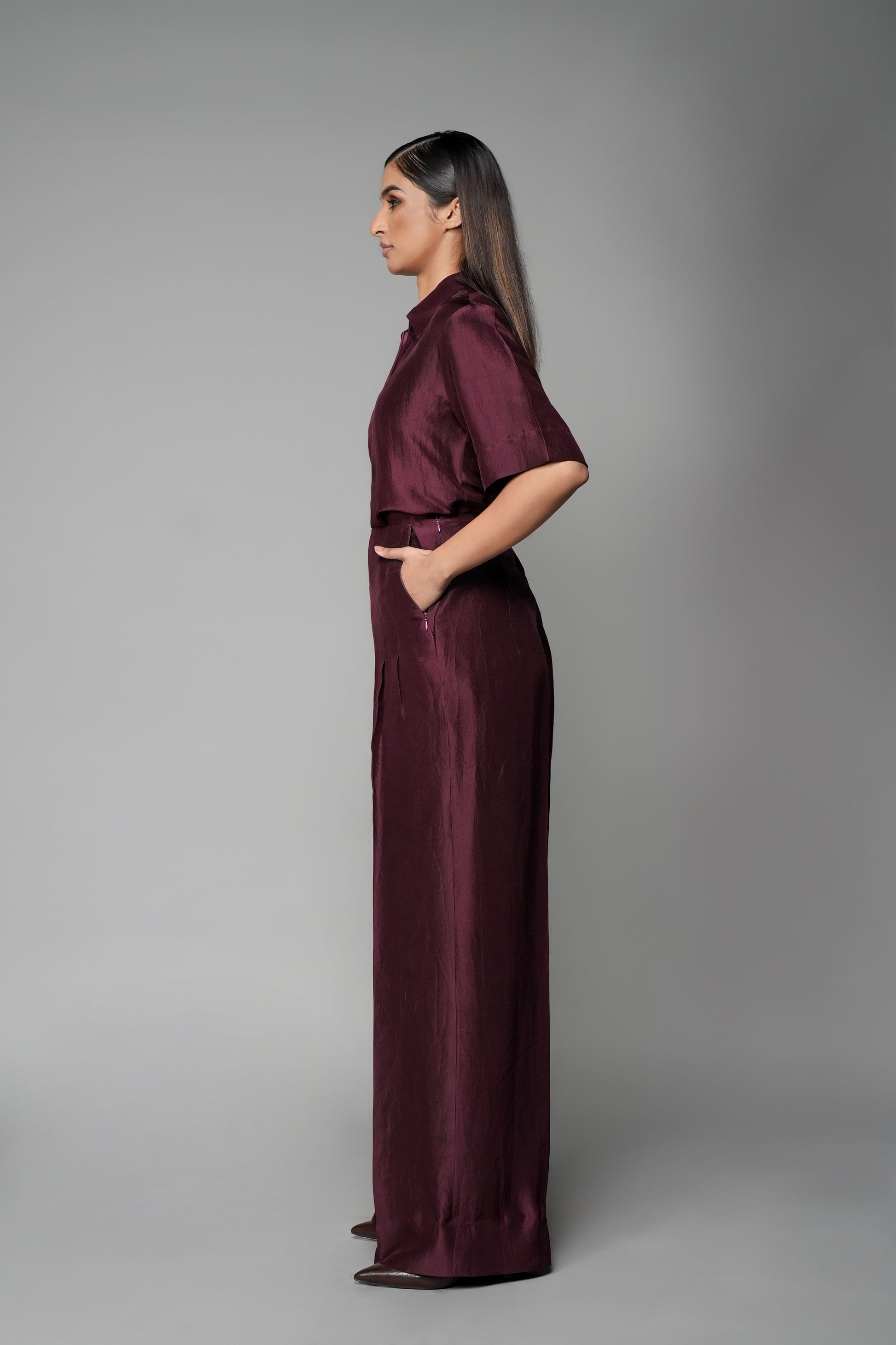 A quiet statement in luxury, this silk trouser in deep plum drapes beautifully, moving with the body and light. It goes beyond dress codes, holding its presence from day into evening with an ease that only time and wear can make richer